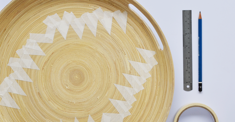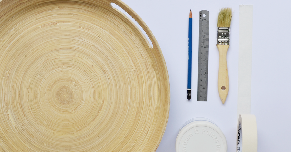 Using a metal ruler and a lead pencil, trace out your pattern onto the surface of your wooden tray. You’ll also need to grab your paint of choice, paintbrush and tape. For this project we used British Paints Love Note White.