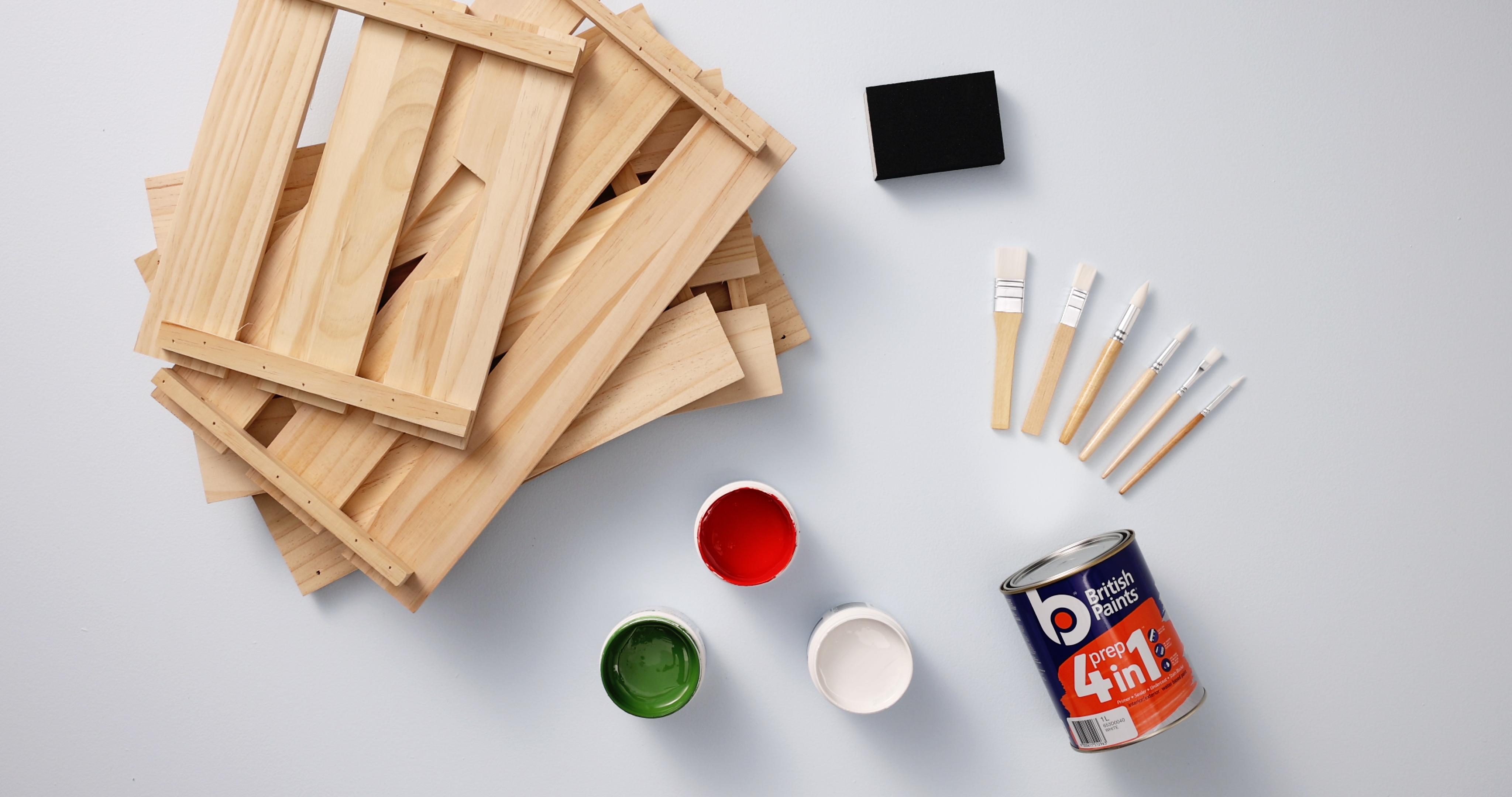 Gather your supplies: Wooden crates in different sizes, a sanding block, flat brushes to prime and paint, British Paints sample pots in the colours you love and British Paints Prep 4in1.