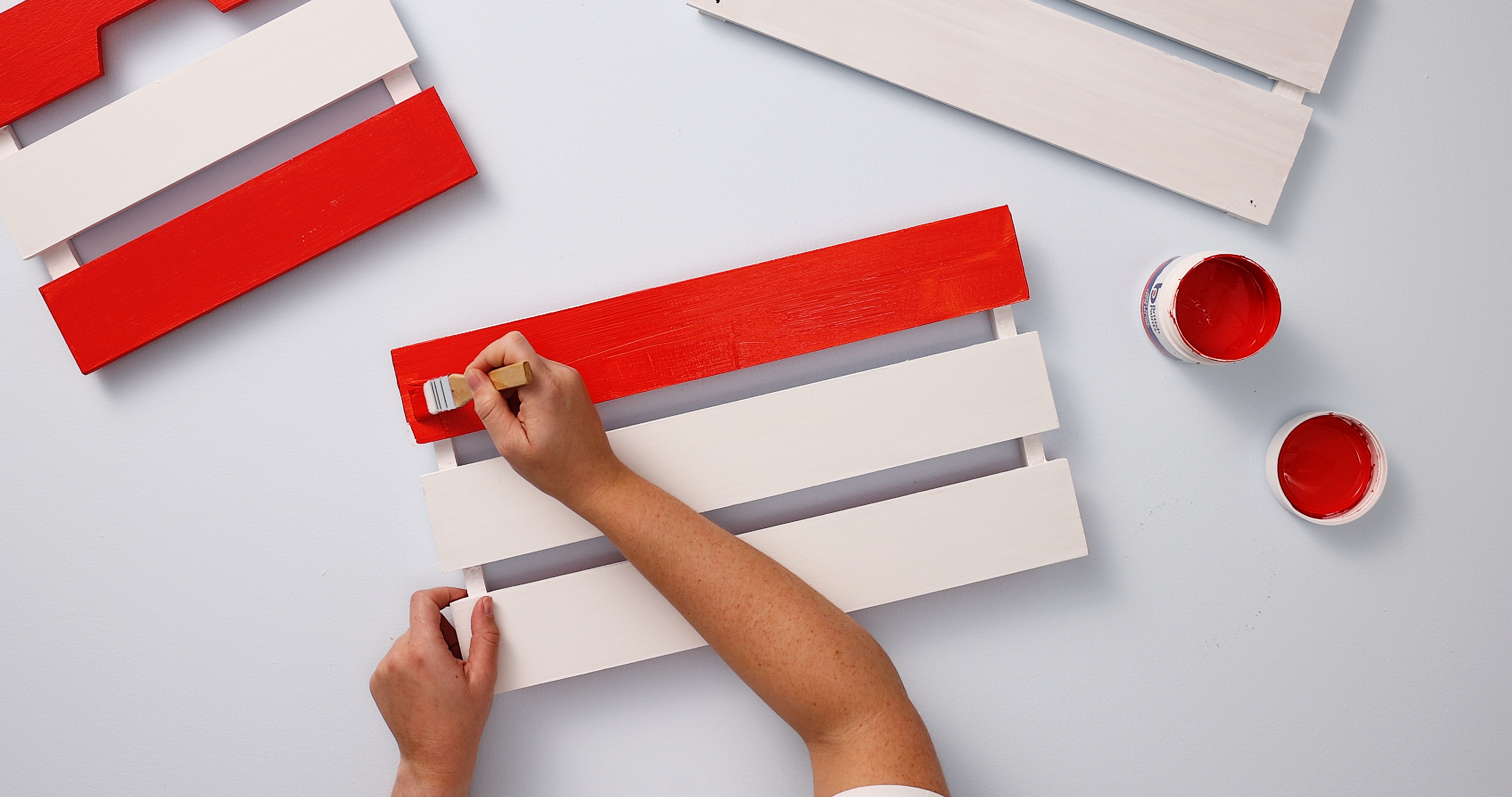 Time to paint: If you plan on sticking to a traditional Christmas theme, use colours Red Bauble and Star White on alternate panels to get a candy cane pattern as shown in the video. Otherwise, use any colour of your choice – the crates will be just as beautiful!