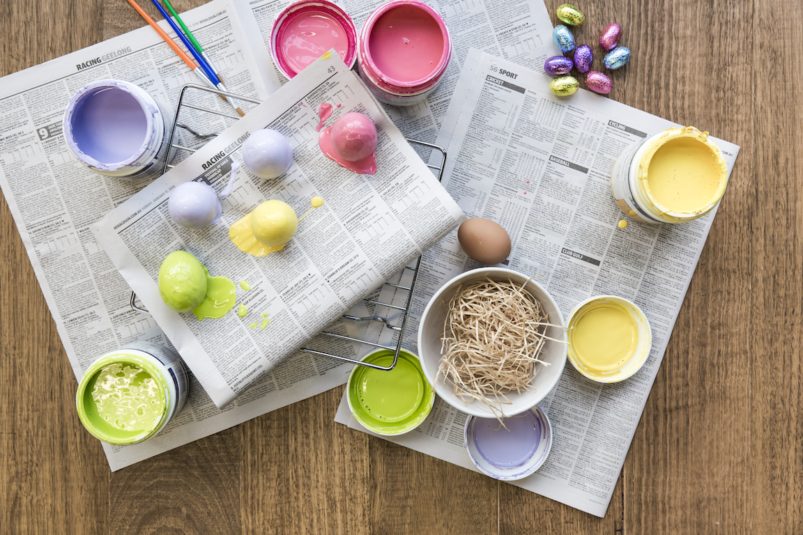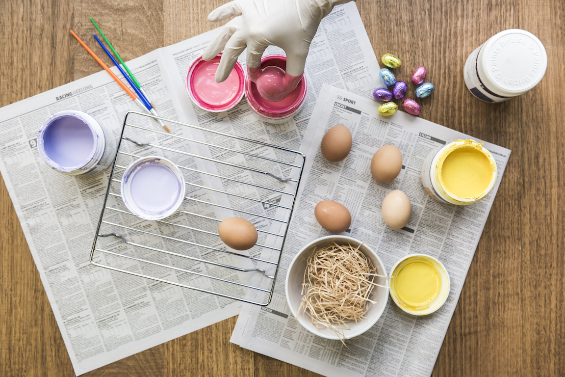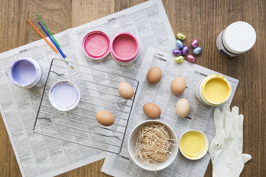 First, gather everything you’ll need to paint and decorate the eggs.