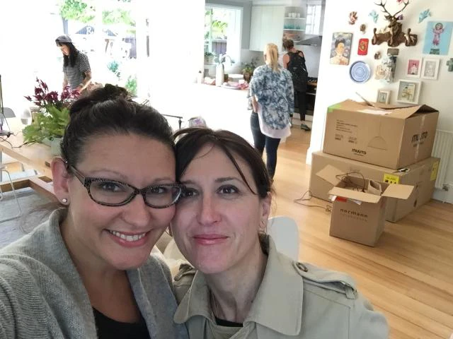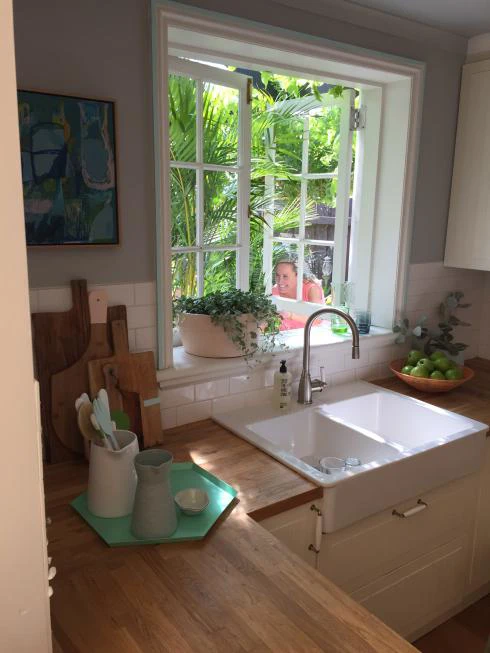 I think the kitchen was my favourite makeover, though. This gorgeous little kitchen went from perfectly fine (all white and a bit rustic) to a room with an edge. The ‘Mineral Salt’ grey runs from the top of the tiles right across the ceiling and creates a really lovely mood. To give it an extra special something (which of course is what we’re always looking for at Inside Out), the team gave the edge of the window frame a touch of the same ‘Reckless Green’ used in the living space and it makes all the difference. I LOVE IT! And just for a laugh, here’s a glimpse of what it looked like from my perspective… getting the plants in EXACTLY the right position is important for a great shot!