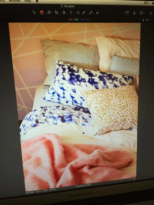 The main bedroom headboard is another brilliant way to create a paint highlight that can be changed over and over as the mood takes you (and we all know how it does). In this case, it was a two-day shoot and on the first day, we decided we wanted a different colour treatment on the bedhead and re-did it overnight, incorporating the ‘Retro Peach’ and ‘Lilac Mood’ in a completely different way. How great is that? The bedroom was a good-size space, but once you get us all in there (photographer, plus assistant, stylist, plus assistant, editor, art director and props), it got pretty crowded!