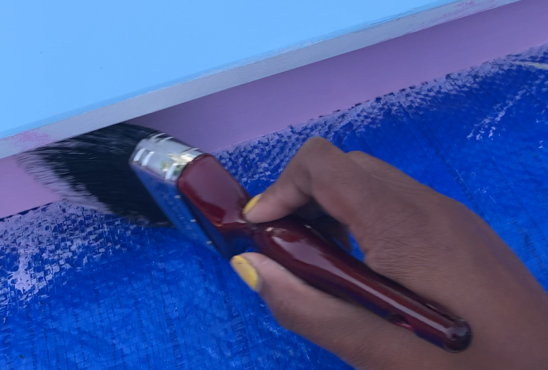 After I mixed the paint, I painted the table legs with British Paints 4 Seasons Golden Butter. Clean, even strokes – 2 coats all up. Make sure you let the paint dry before applying a second coat. (wait 2 hours). Next I painted the table top with British Paints 4 Seasons I’m Blue. I used a roller to cover as much surface area as possible at once. Load your roller with plenty of paint, start at one end and work across the table then down. It’s so quick and the paint looks so crisp and clean!