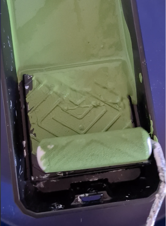 Pour about a cup of paint into your roller tray, then grab your roller and get it good and saturated with paint so that when you start rolling you’re not having to press down tightly to squeeze the liquid onto your painting surface.